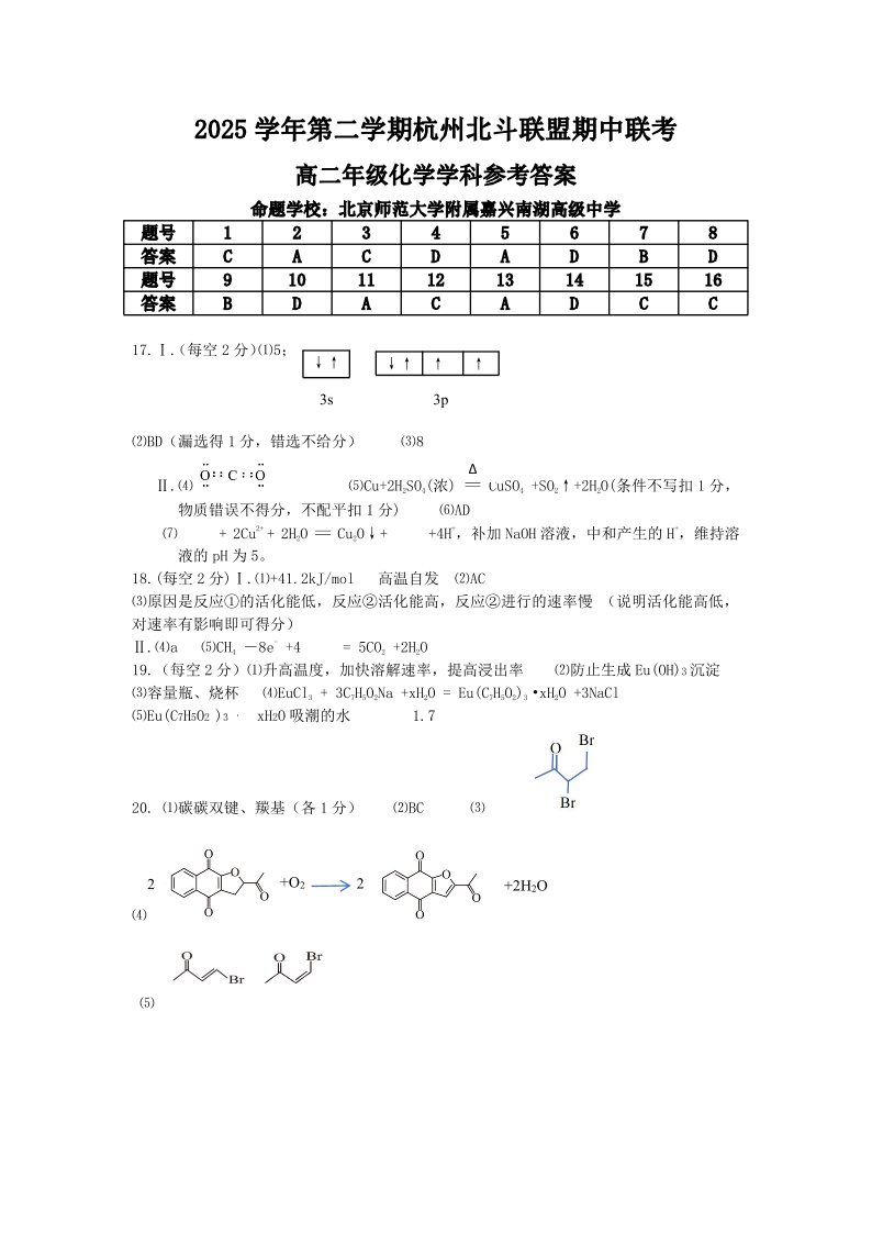 浙江省杭州市北斗联盟2025学年第二学期高二年级期中联考 化学答案.pdf