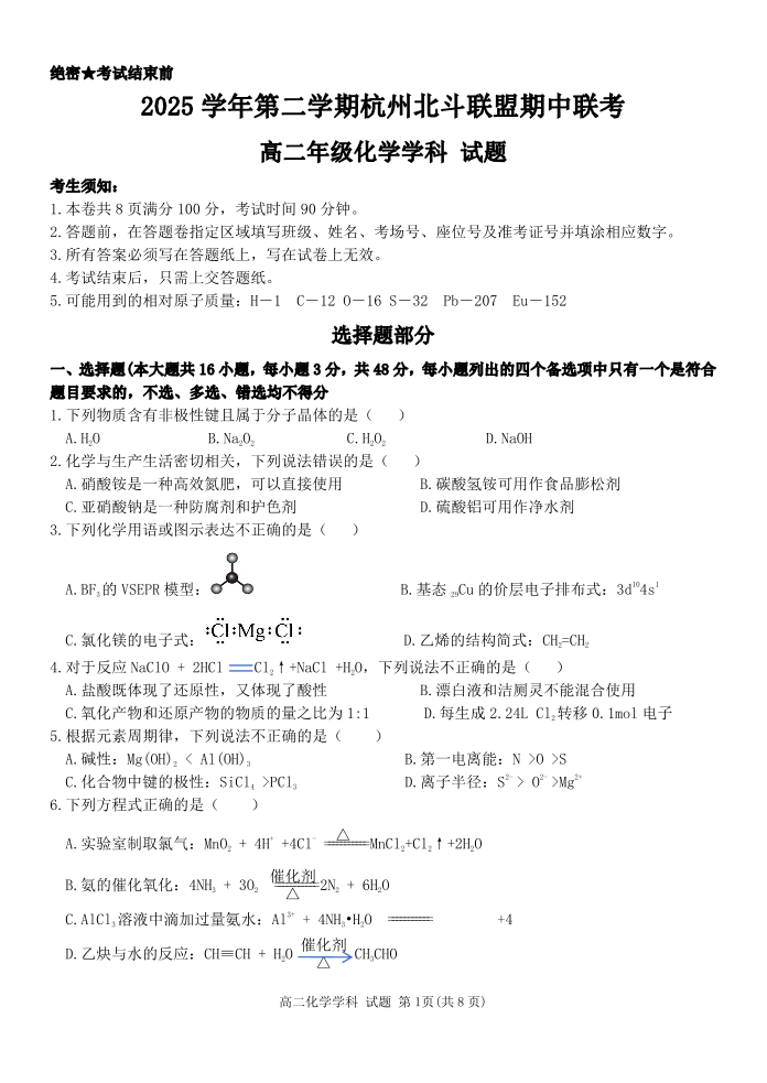 浙江省杭州市北斗联盟2025学年第二学期高二年级期中联考 化学.pdf