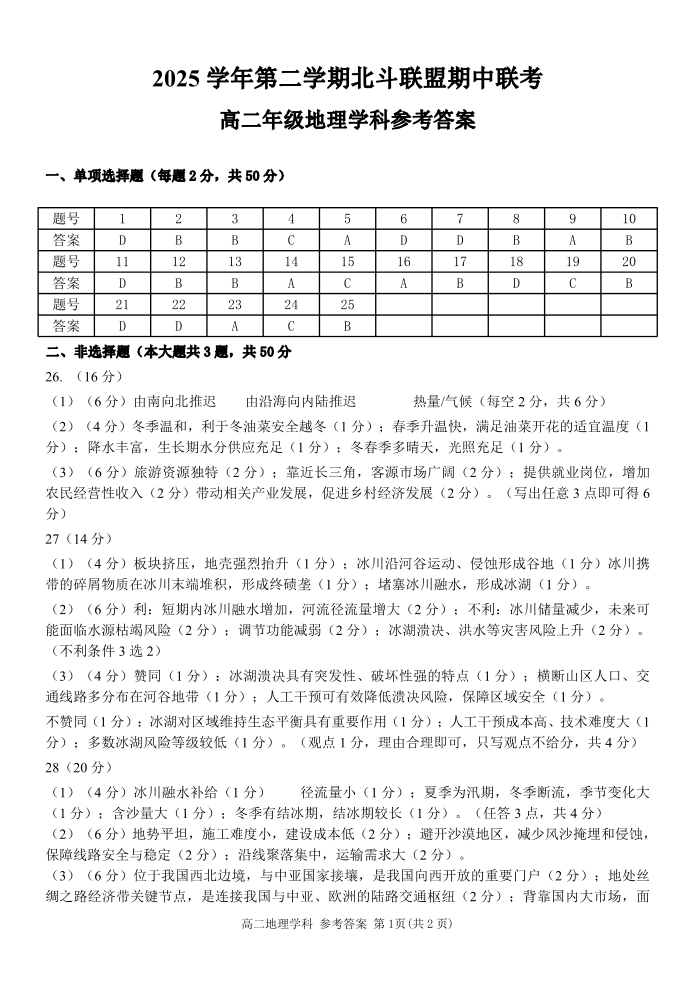 浙江省杭州市北斗联盟2025学年第二学期高二年级期中联考 地理答案.pdf