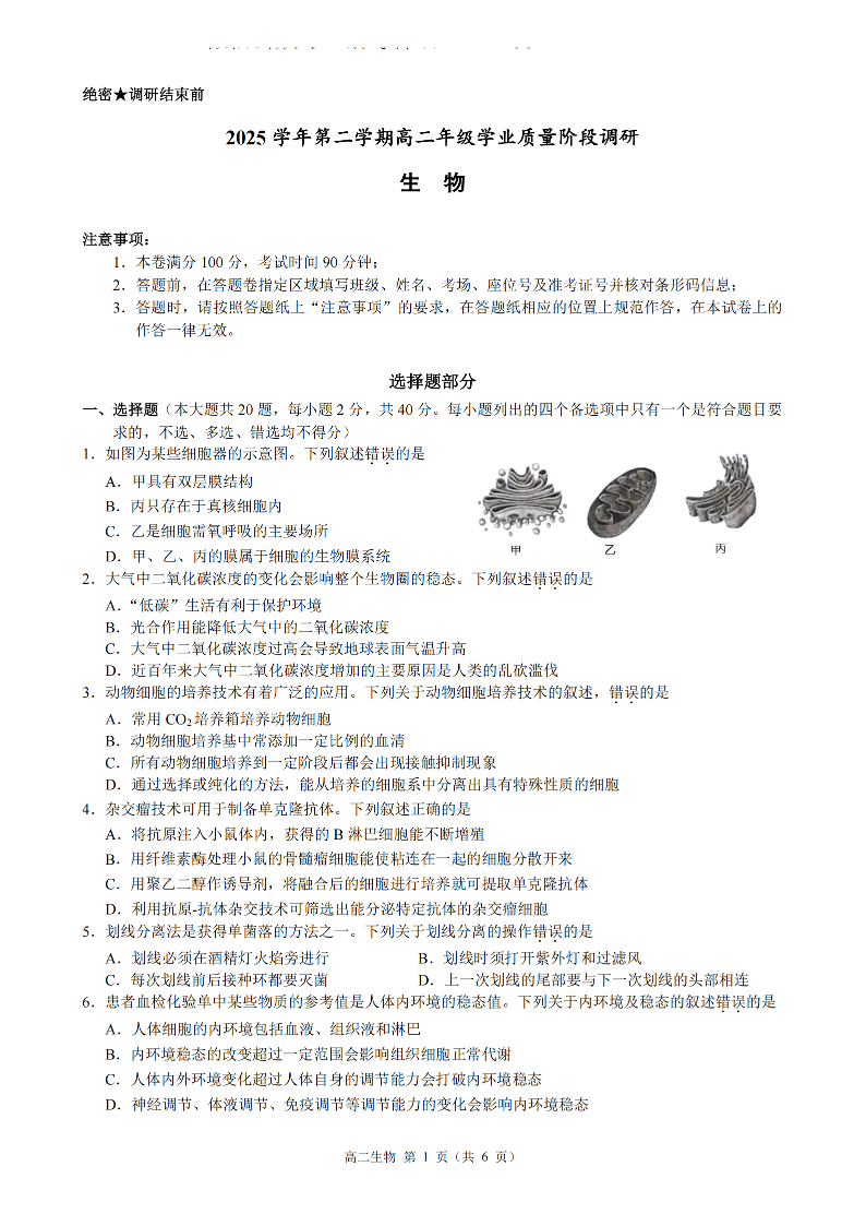浙江省9+1联盟2025学年第二学期高二年级学业质量阶段调研 生物.pdf