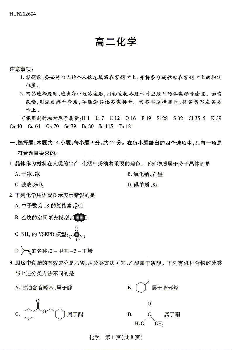 湖南省湘一名校联盟2026年高二年级4月联考 化学.pdf