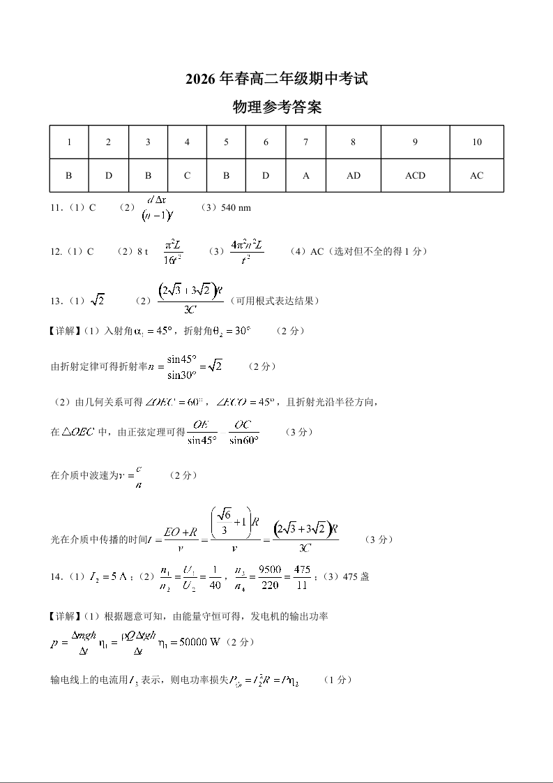 湖北省鄂东南联盟2025-2026学年高二下学期期中联考 物理答案.docx