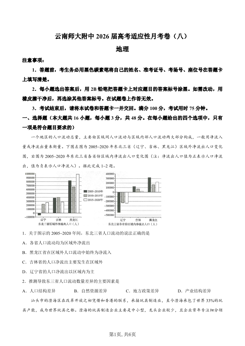 云南师大附中2026届高考适应性月考卷(八)地理试题(含答案).pdf