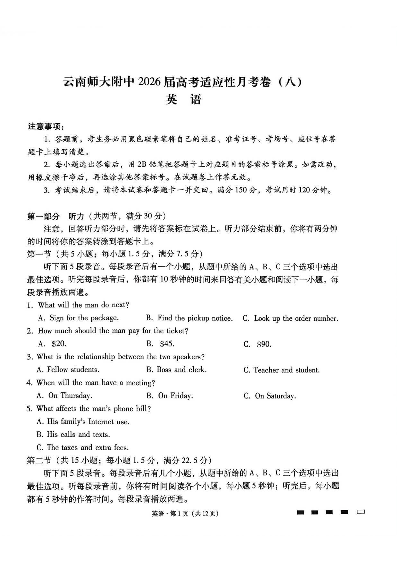 云南师大附中2026届高考适应性月考卷(八)英语试题(含答案).pdf