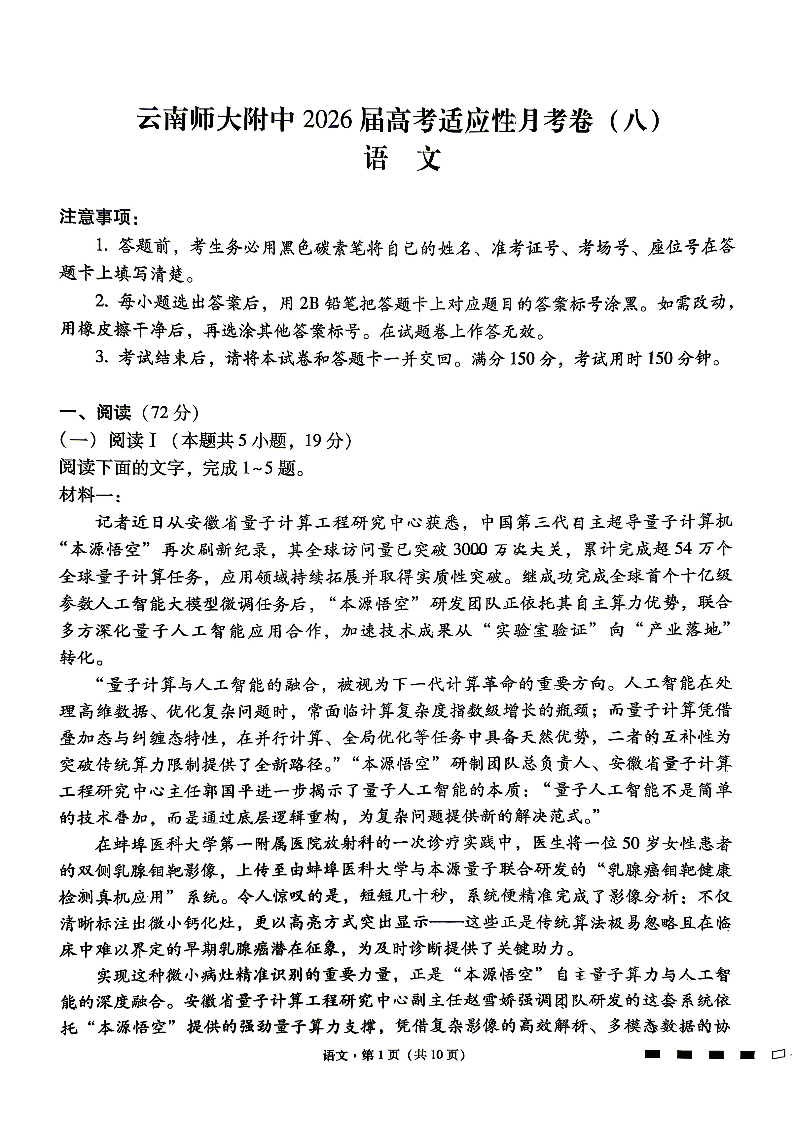 云南师大附中2026届高考适应性月考卷(八)语文试题(含答案).pdf