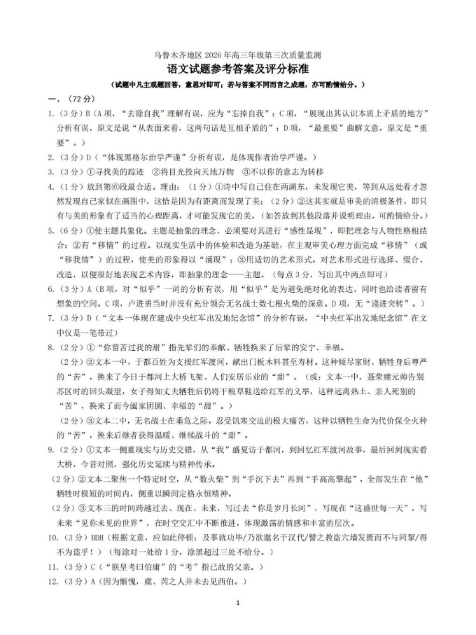 乌鲁木齐地区2026年高三年级第三次质量监测 语文答案.pdf