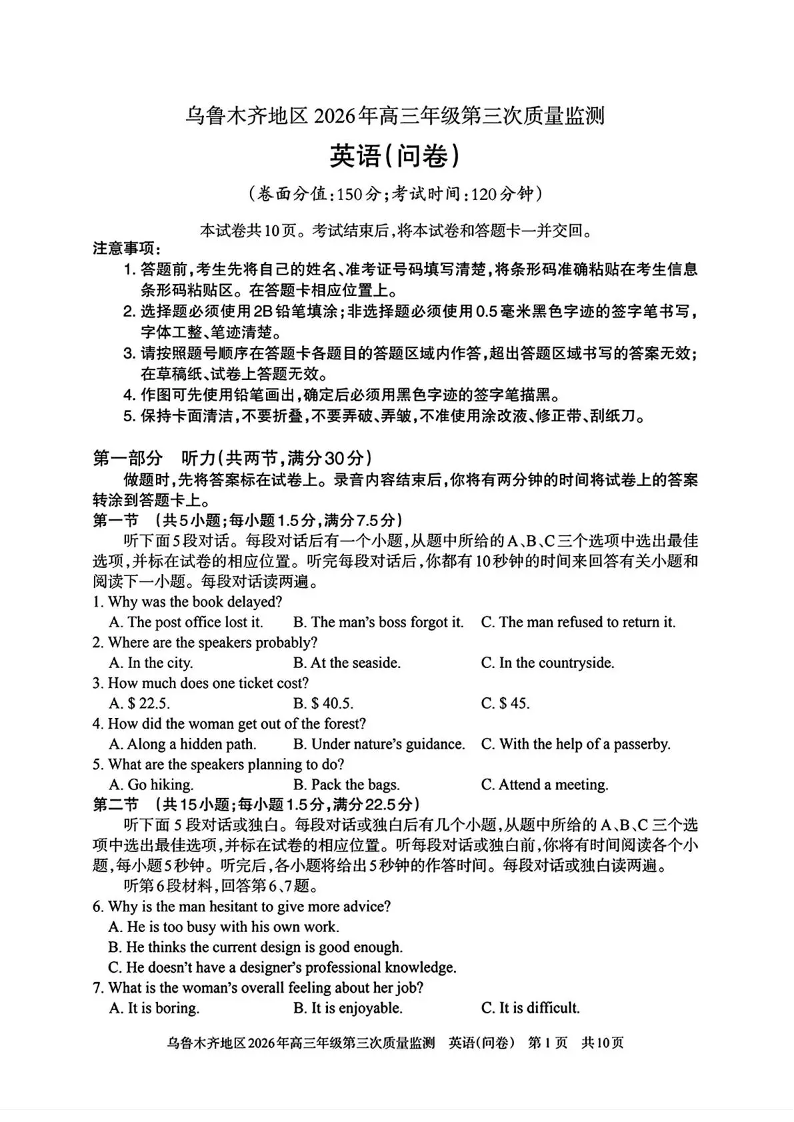 乌鲁木齐地区2026年高三年级第三次质量监测 英语.pdf