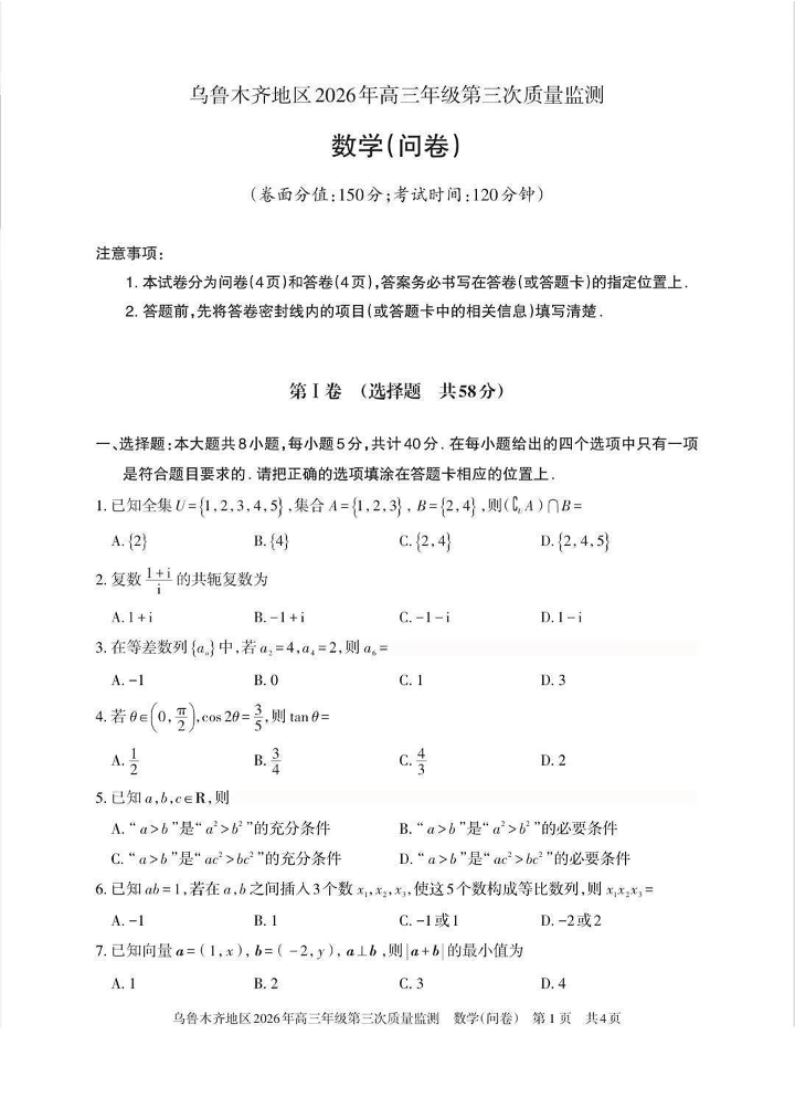 乌鲁木齐地区2026年高三年级第三次质量监测 数学.pdf