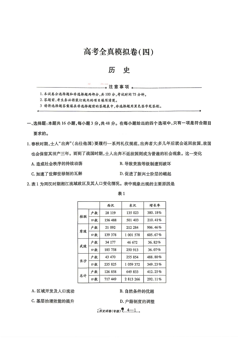 陕西省西安市2026届高三年级4月高考全真模拟卷(四) 历史试题(含答案).pdf