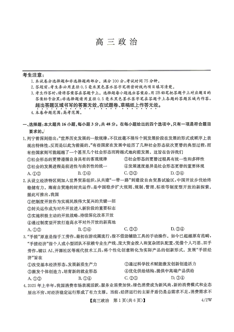 九师联盟2025-2026学年高三第二学期期中考试 政治试卷(含答案).pdf