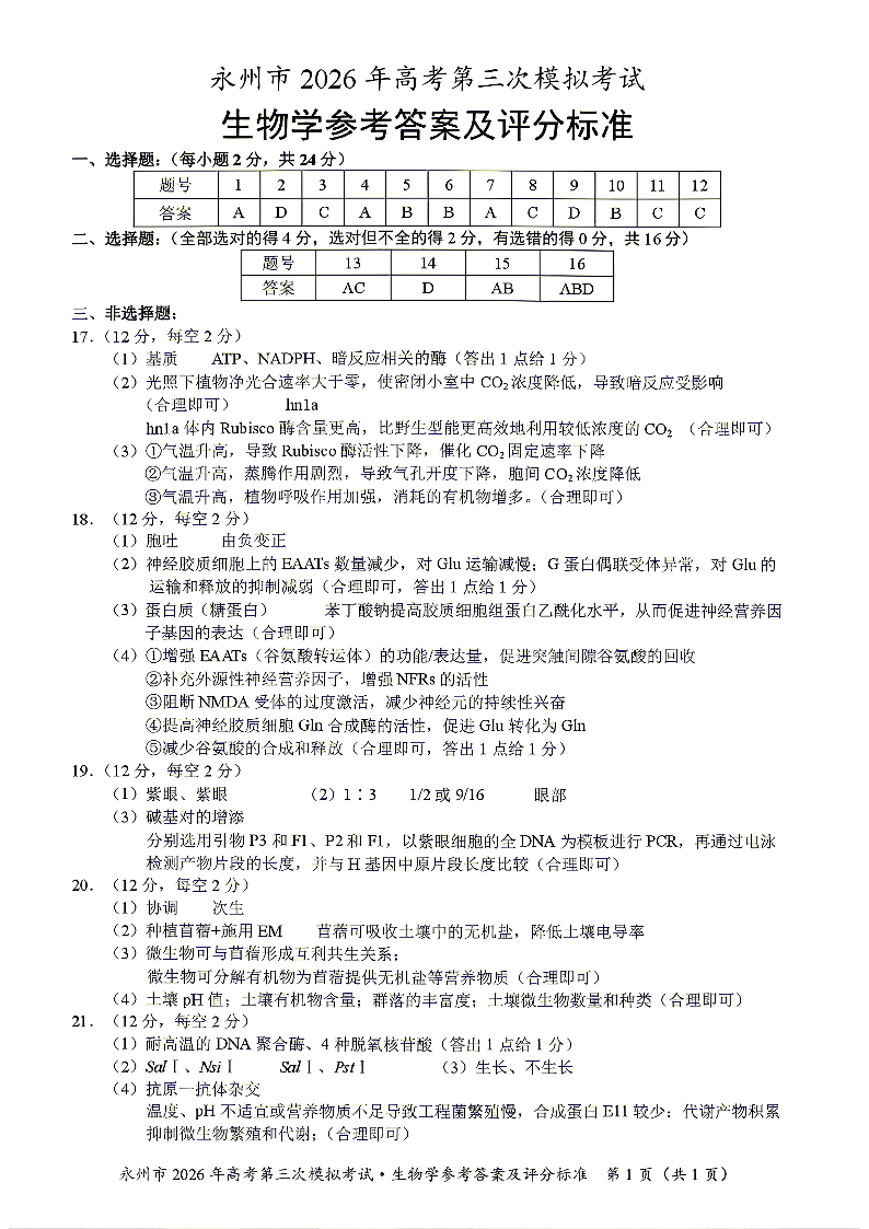 湖南省永州市2026年高考第三次模拟考试 生物答案.pdf