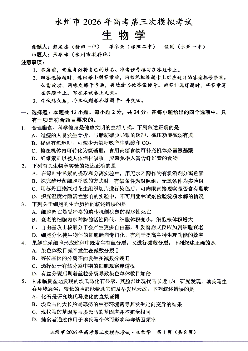 湖南省永州市2026年高考第三次模拟考试 生物.pdf