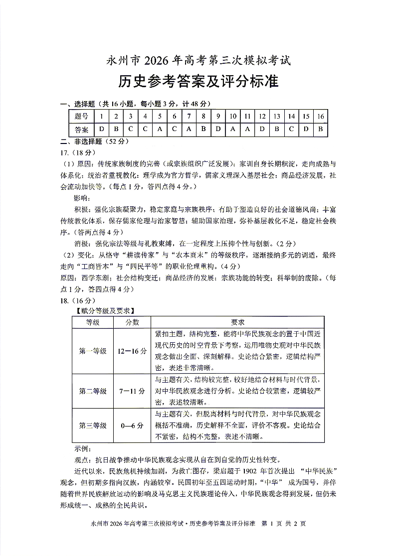 湖南省永州市2026年高考第三次模拟考试 历史答案.pdf