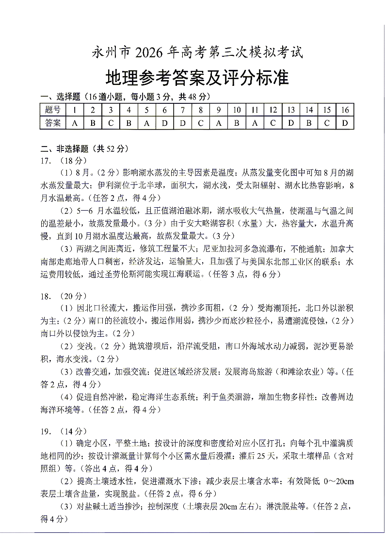 湖南省永州市2026年高考第三次模拟考试 地理答案.pdf