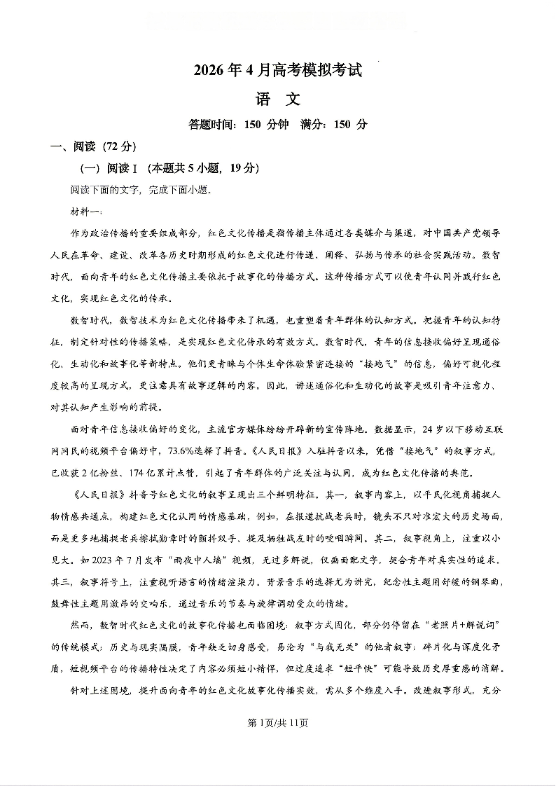 辽宁省实验中学2026年4月高考模拟考试 语文试题(含答案).pdf