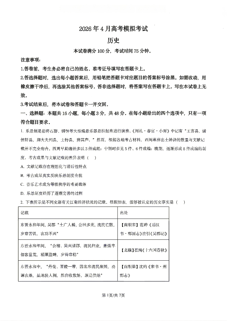 辽宁省实验中学2026年4月高考模拟考试 历史试题(含答案).pdf