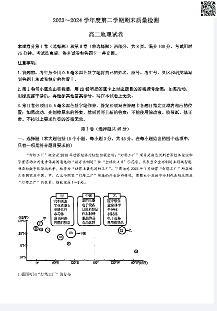 湖北省武汉市江岸区2023-2024学年高二下学期7月期末考试 地理