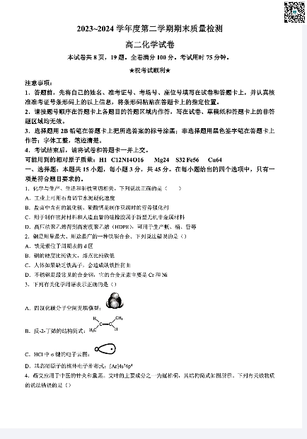 湖北省武汉市江岸区2023-2024学年高二下学期7月期末考试 化学