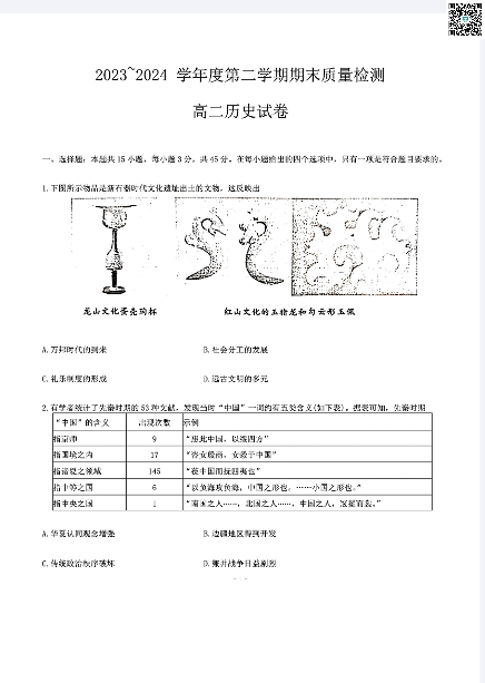 湖北省武汉市江岸区2023-2024学年高二下学期7月期末考试 历史