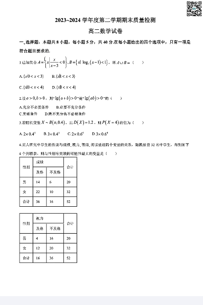 湖北省武汉市江岸区2023-2024学年高二下学期7月期末考试 数学