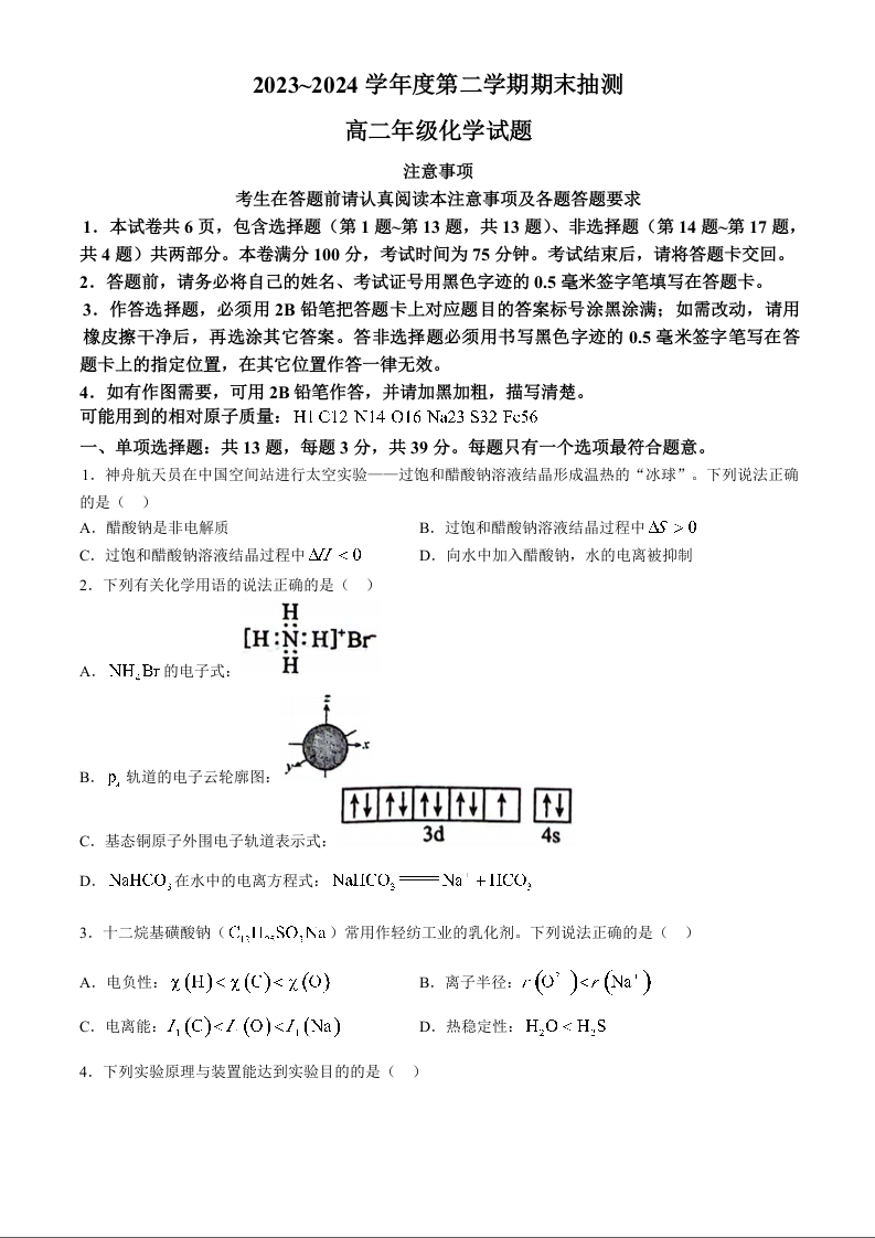 江苏省徐州市2023-2024学年高二下学期6月期末考试化学试题(无答案)