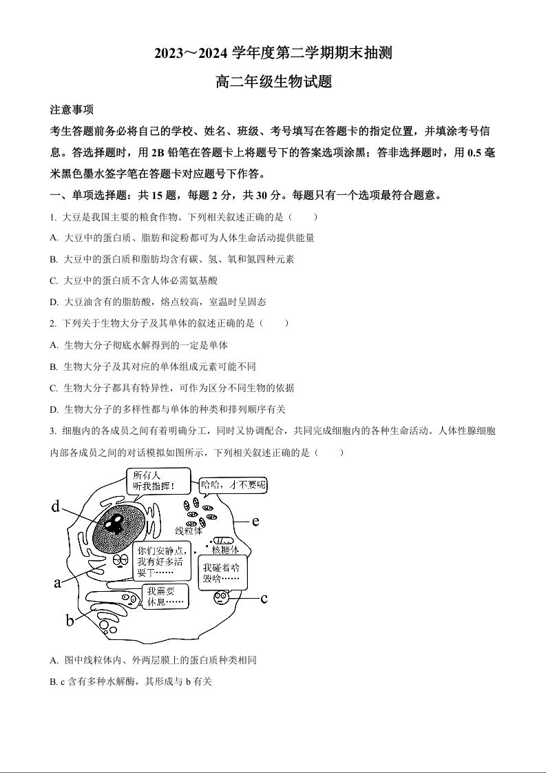 江苏省徐州市2025届2023-2024学年高二下学期期末抽测考试 生物