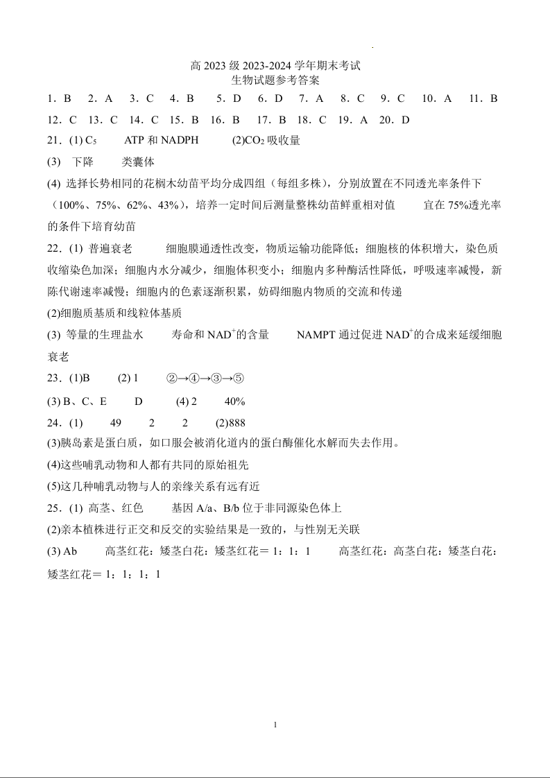 四川省泸县第五中学高2023级2024年春期高一期末考试 生物答案