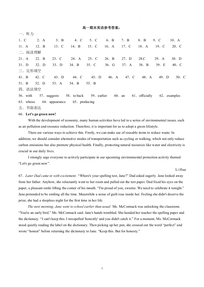 四川省泸县第五中学高2023级2024年春期高一期末考试 英语答案