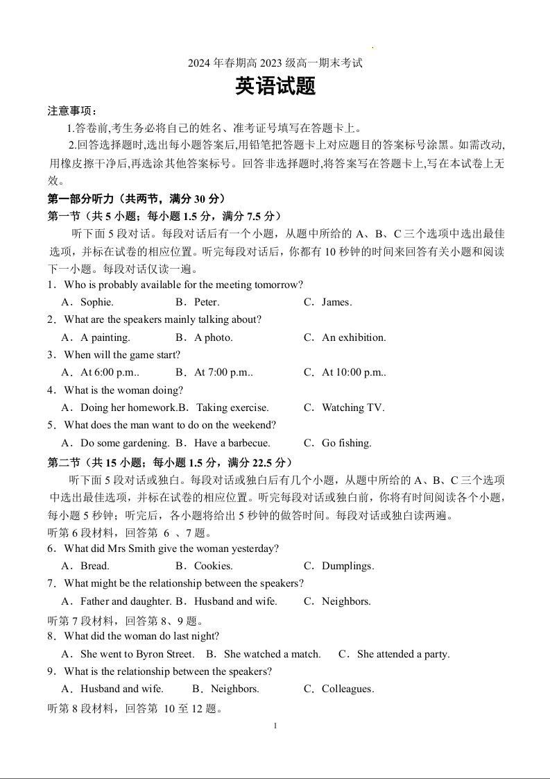 四川省泸县第五中学高2023级2024年春期高一期末考试 英语