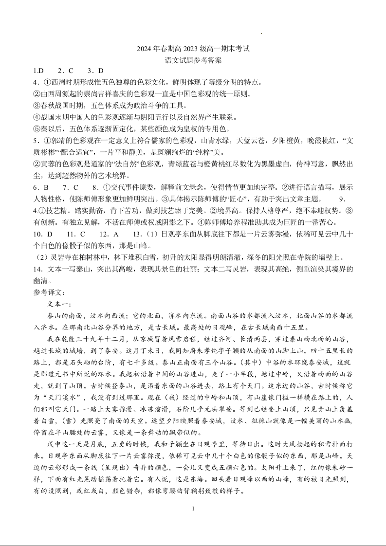 四川省泸县第五中学高2023级2024年春期高一期末考试 语文答案