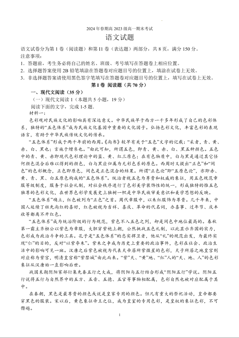 四川省泸县第五中学高2023级2024年春期高一期末考试 语文