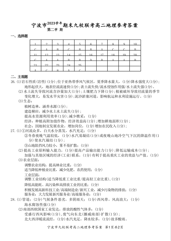 浙江省宁波市九校联考2023-2024学年高二下学期6月期末联考考试 地理答案