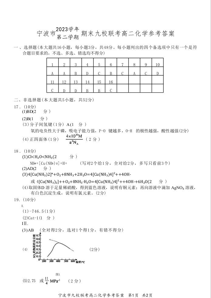 浙江省宁波市九校联考2023-2024学年高二下学期6月期末联考考试 化学答案