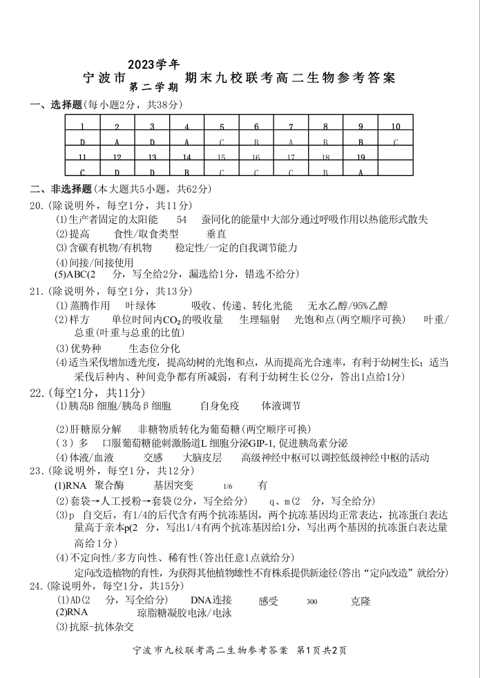 浙江省宁波市九校联考2023-2024学年高二下学期6月期末联考考试 生物答案