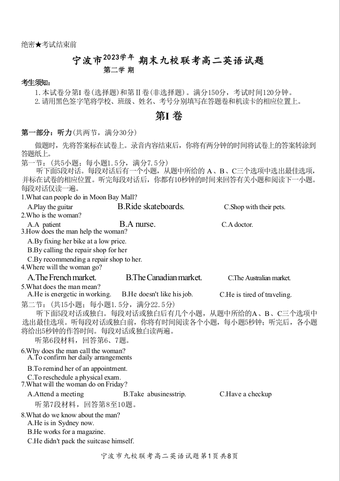 浙江省宁波市九校联考2023-2024学年高二下学期6月期末联考考试 英语