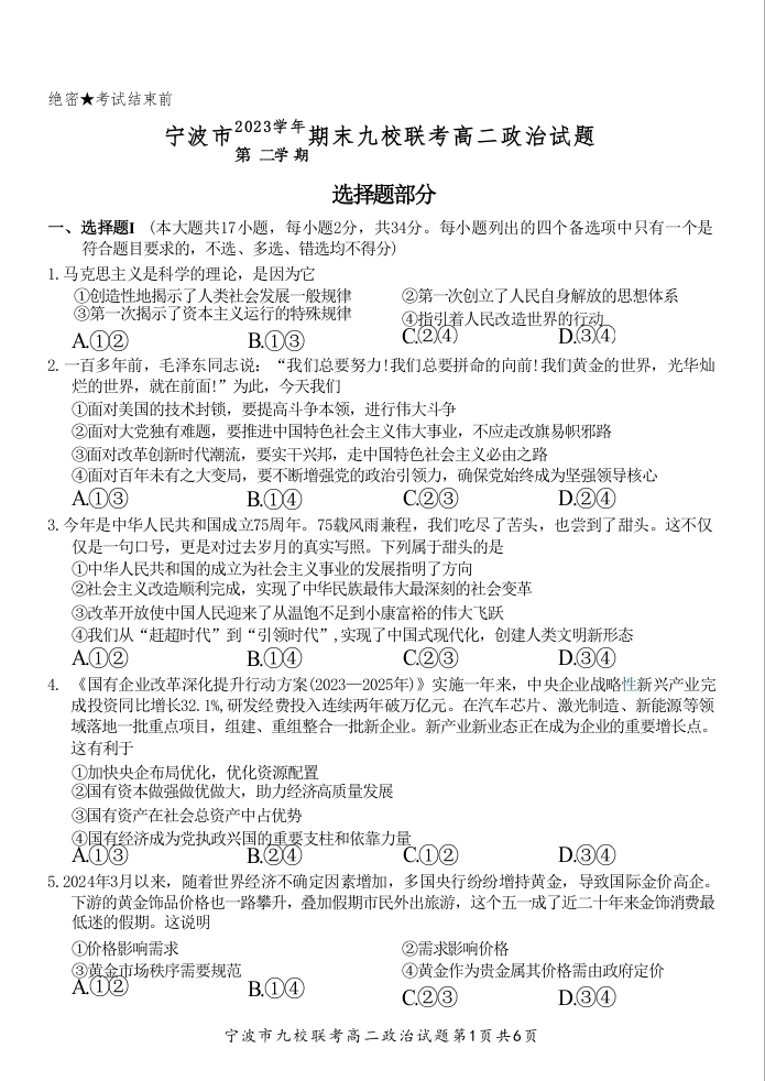 浙江省宁波市九校联考2023-2024学年高二下学期6月期末联考考试 政治