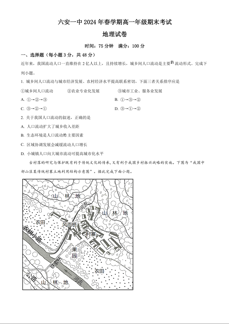 六安一中2024年春学期高一年级期末考试 地理