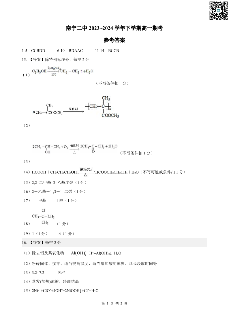 南宁二中2024年春季期末高一化学答案