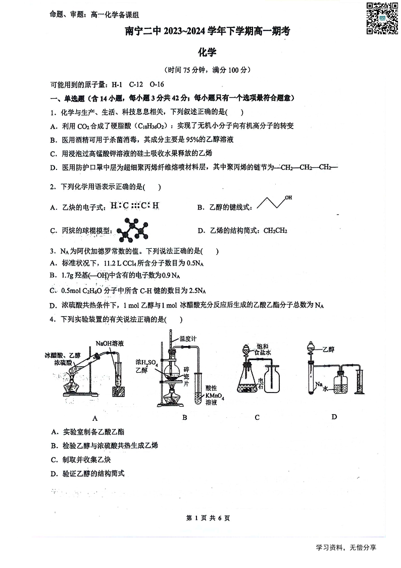 南宁二中2024年春季期末高一化学试卷