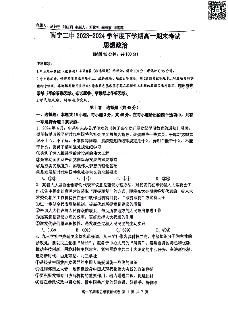南宁二中2024年春季期末高一政治试卷