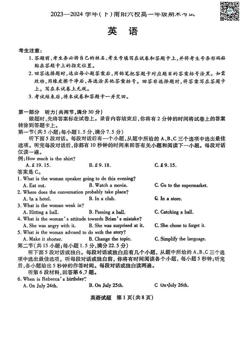 河南省南阳市六校2023-2024学年高一下学期期末联考 英语