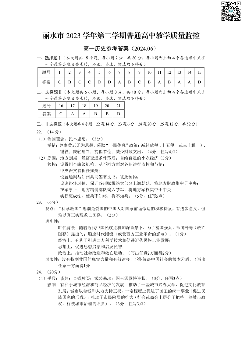 丽水市2023学年高一第二学期普高教学质量监控测试 历史答案