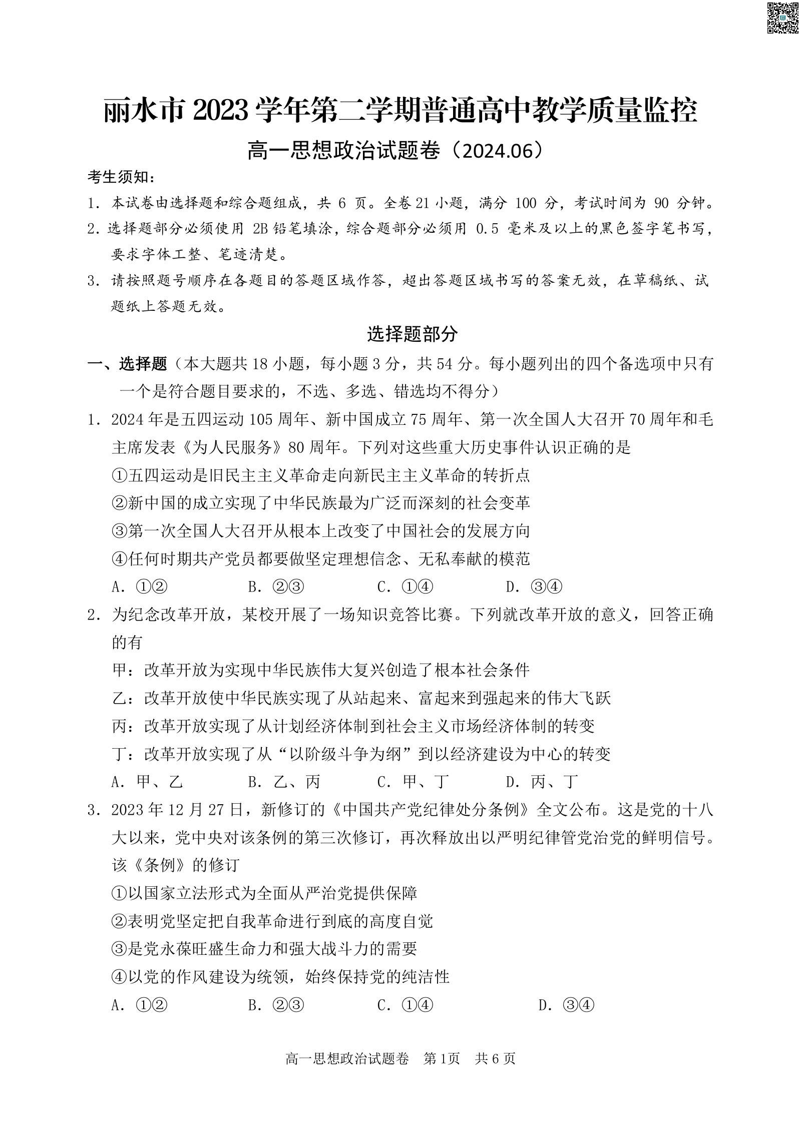 丽水市2023学年高一第二学期普高教学质量监控测试 政治