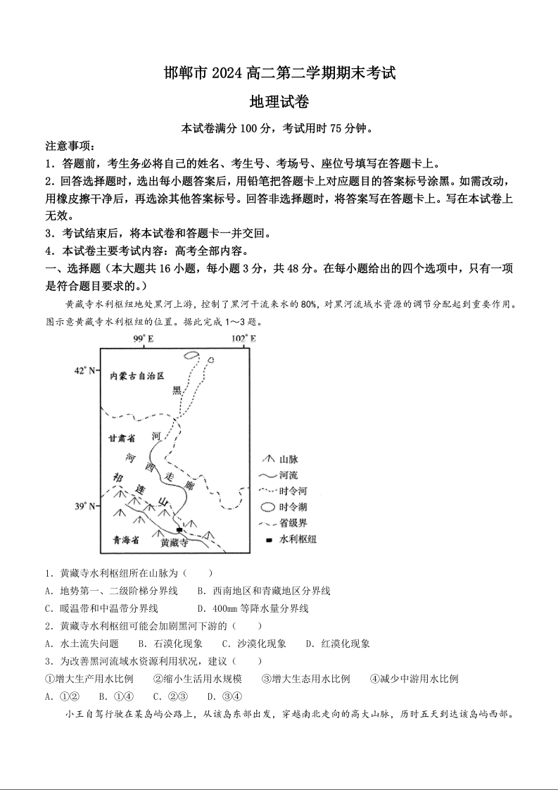 河北省邯郸市2023-2024学年高二第二(下)学期期末考试 地理
