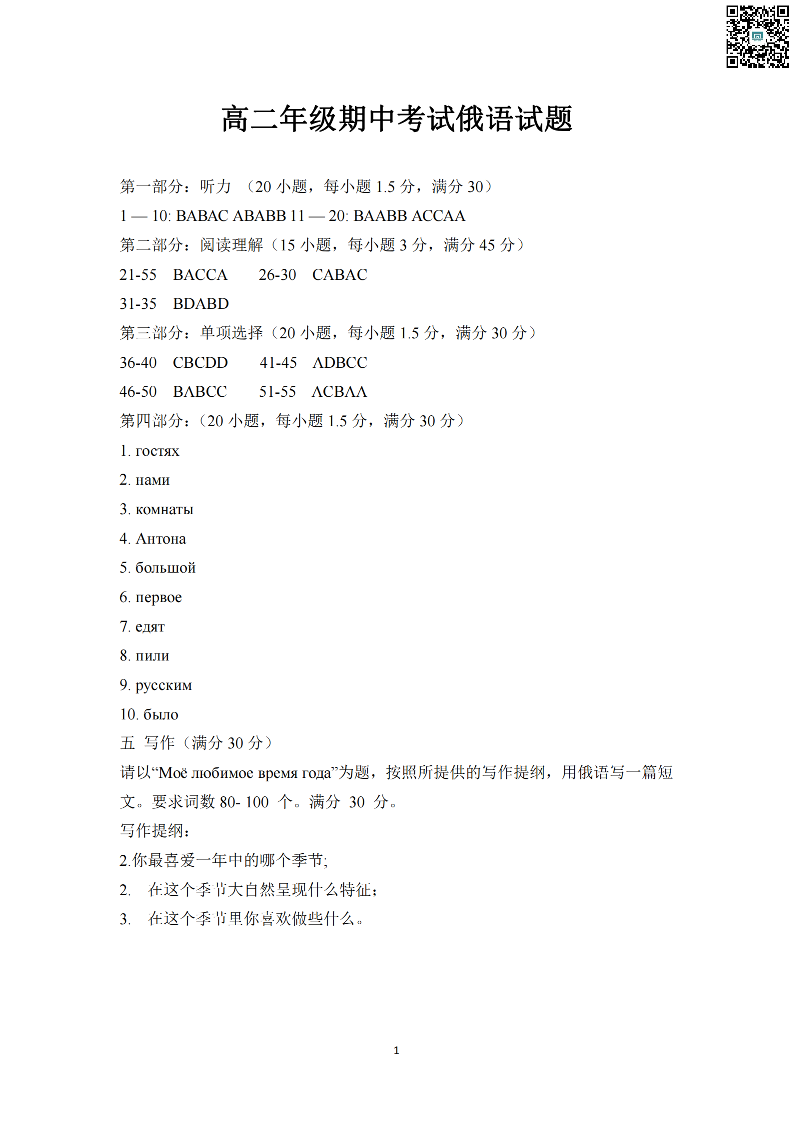 河北省邯郸市2023-2024学年高二第二(下)学期期末考试 俄语答案
