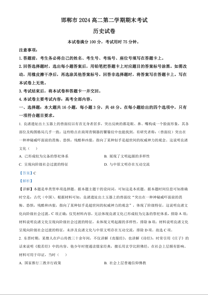 河北省邯郸市2023-2024学年高二第二(下)学期期末考试 历史答案
