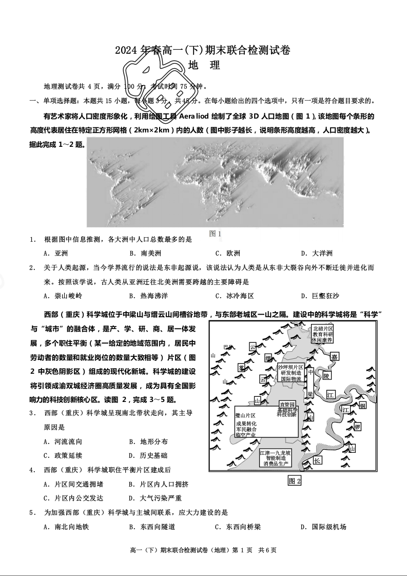重庆市2024 年春高一(下)期末联合检测 地理