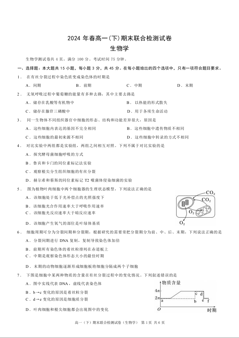 重庆市2024 年春高一(下)期末联合检测 生物