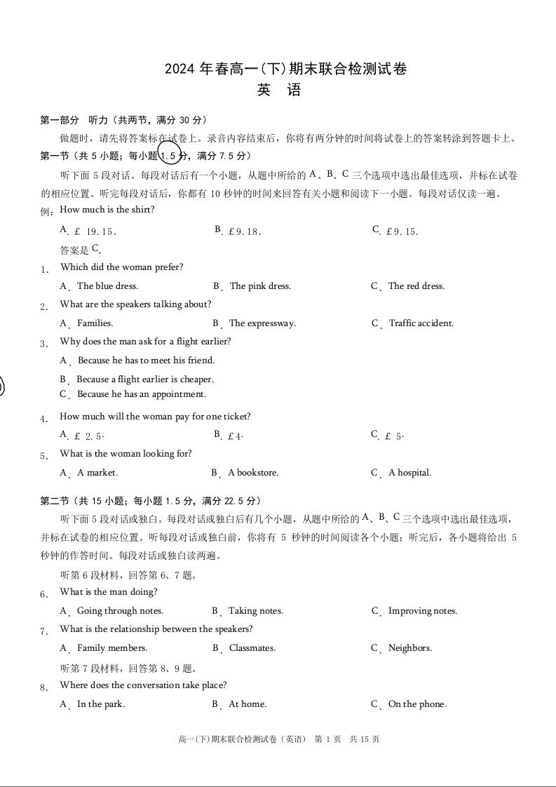 重庆市2024 年春高一(下)期末联合检测 英语
