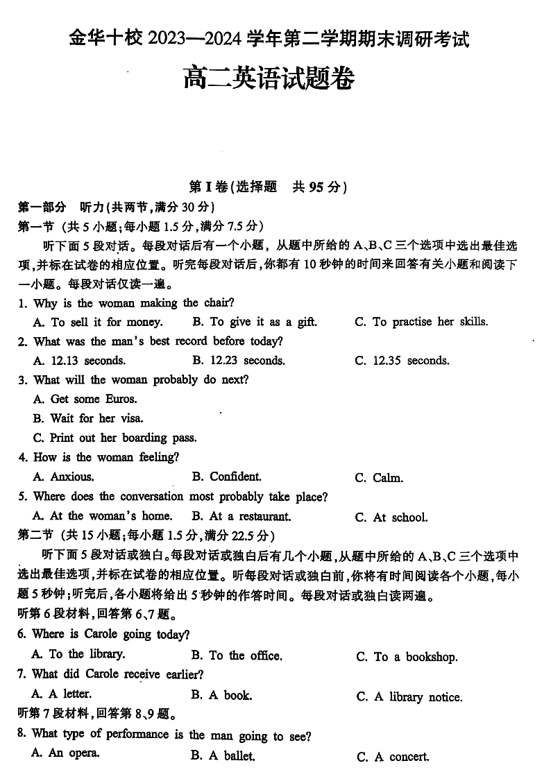 浙江省金华市金华十校2025届高二下学期期末联考考试 英语